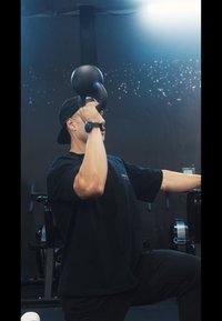 • Camisola desportiva preta; calças pretas; ténis brancos; homem a ajoelhar-se, a levantar uma bola medicamentosa preta texturada acima da cabeça; fundo de ginásio.