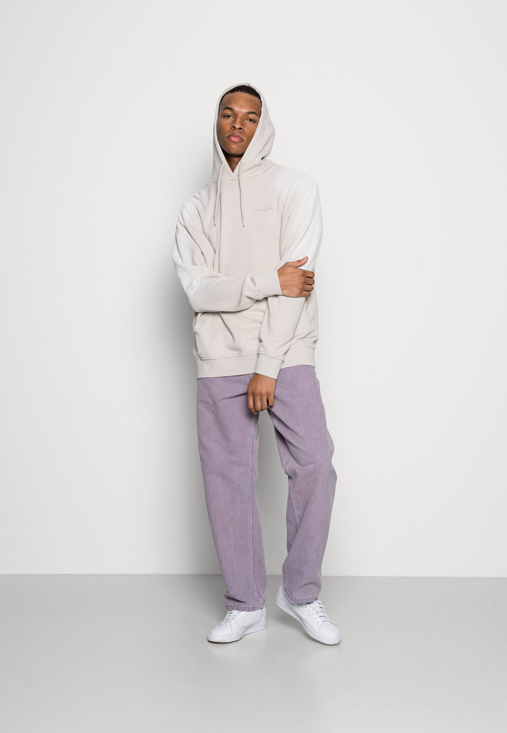 Camisa bege com logo vermelho, mangas longas brancas, combinada com jeans soltos azuis e sapatos pretos com atacadores. Ambiente urbano com plantas e paredes de pedra.