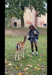 • Jovem mulher com um casaco cinza oversized, saia curta, collants pretos, meias brancas e sapatos pretos, de pé na relva com árvores de outono ao fundo.