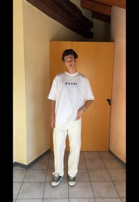 • T-shirt oversized branca com o logótipo "MARNI", combinada com calças largas creme e ténis pretos. Tecido suave, ajuste casual, design minimalista.