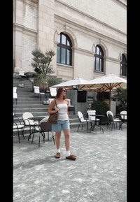 • Bolsa de ombro leve castanha, top branco, calções de ganga e sapatos castanhos de estilo mocassino. Cercada por mesas e guarda-sóis.