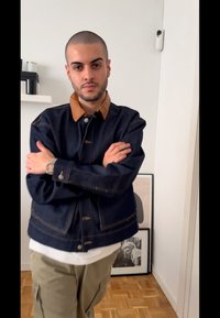 • Casaco de ganga azul-marinho com colarinho castanho, grandes botões prateados e um bolso frontal. Usado sobre uma t-shirt branca e combinado com calças cargo caqui.