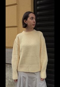 • Pulôver de malha na cor creme com mangas oversized, combinado com uma saia plissada branca. Uma bolsa tecida preta adiciona contraste contra o fundo texturizado.