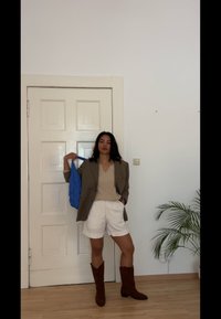 • Blazer oversized em verde-azeitona, suéter bege canelado, calções brancos e botas de cowboy castanhas. Bolsa azul e planta folhosa ao fundo.