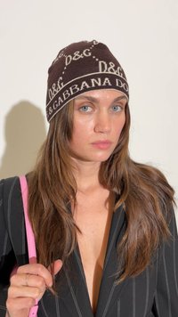 • Blazer preto riscado, segurando uma pequena mala rosa a tiracolo. A mala apresenta uma textura suave e um detalhe em logótipo prateado. Gorro castanho com padrão.